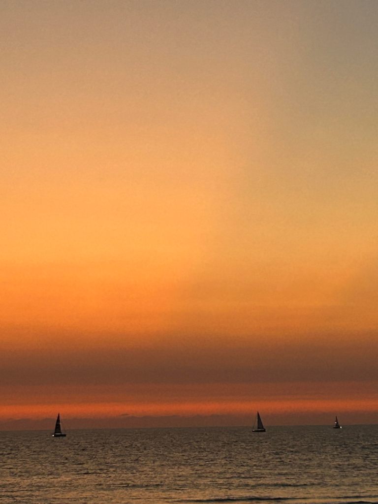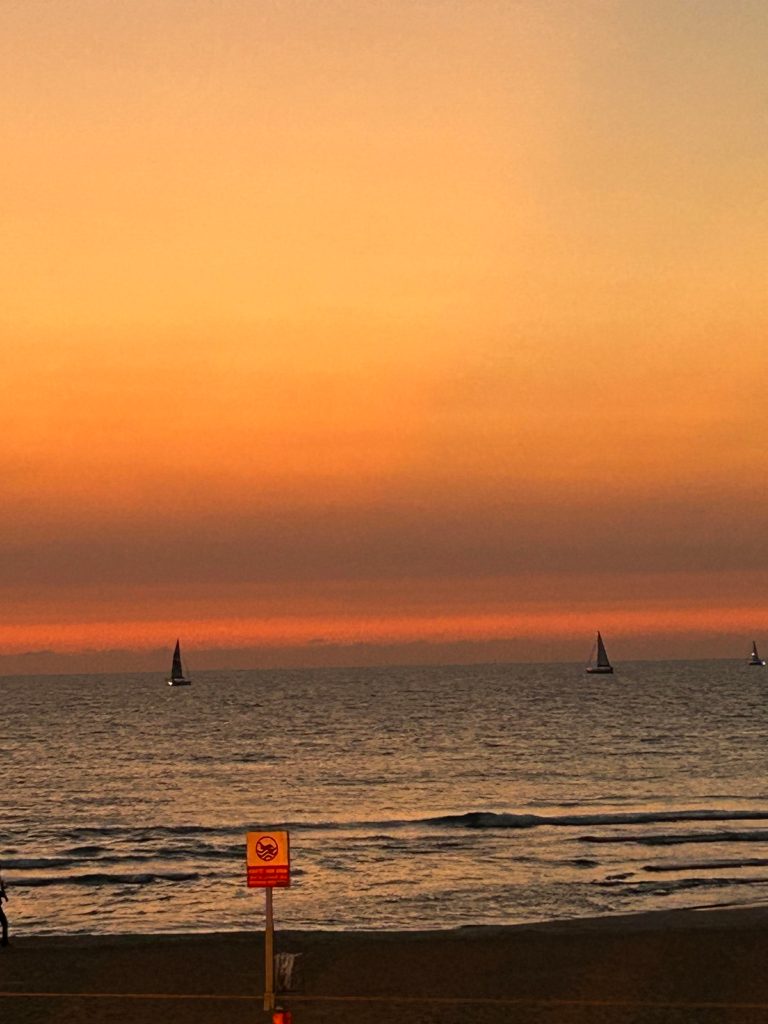 משמאלי שקיעה מהממת. תכף אשב לארוחת ערב עם חברה טובה מול הים. 24 שעות אחרי כן אחזור אל ברלין שמכוסה בערפל וקרירות וצבעים עזים של סתיו.