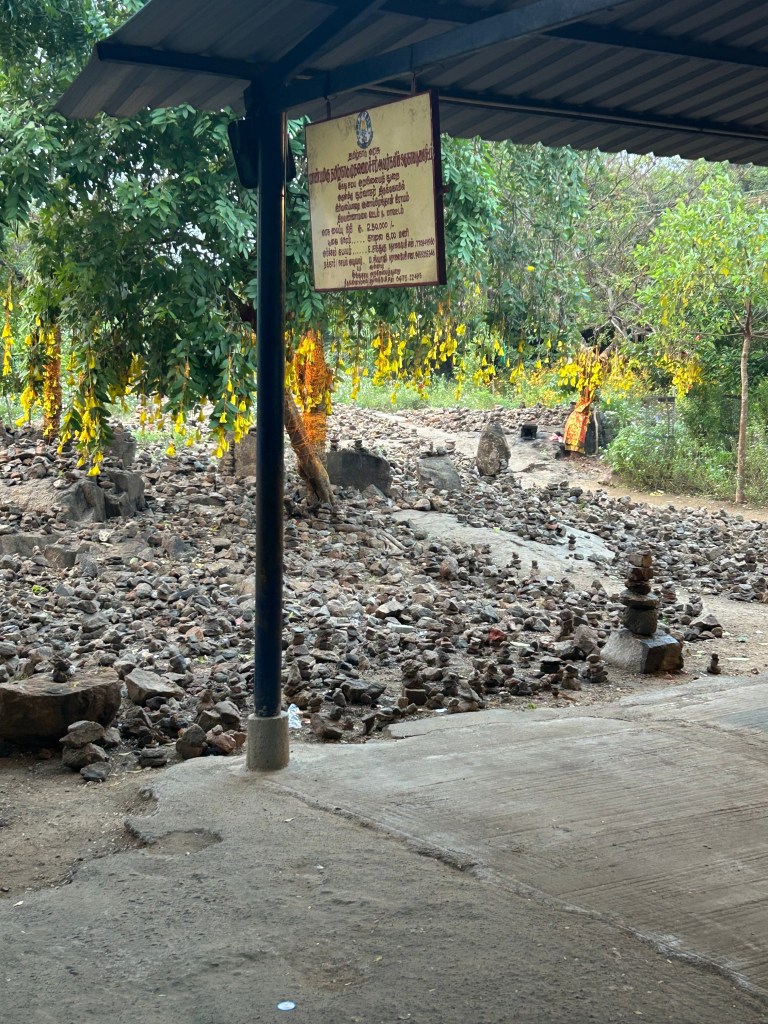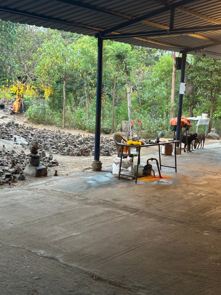 לאורך המסלול שמקיף את ההר יש הרבה מקדשים. אחד מהם, ממש קטן, לידו יש שנים או שלושה עצים שתלויים מהם חתיכות בד צהובות, שאני בטוחה שקשורות איכשהו לאיזהשהו סוג של פולחן, אבל אני לא יודעת מה ואיזה. מתחת לאחד העצים יש המון מגדלים של אבנים מסודרים יפה ואת הכל מקיפה גינה פורחת, מפתיעה, לא קשורה לכלום. במקום חיים ומטפלים שלושה סאדוהים. אנשים שאין להם כלום משל עצמם. עמדתי שם להסתכל. קיוותי שיבואו מקומיים ויעשו משהו שיבהיר לי מה עושים עם הסרטים הצהובים. זה לא קרה. מי שכן הגיעו זה חמש או שש כלבים משוטטים. אחד הסאדוהים שיחק איתם, ליטף, דיבר, קם והלך לאנשהו וחזר עם עוגיות וחילק להם, הסתכל עליהם אוכלים, ליטף להם את הראש, הביא גם מים בכלי והניח אותו ביניהם.