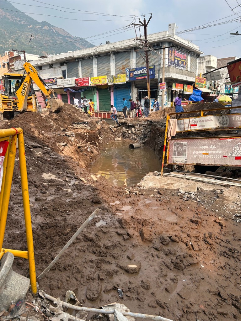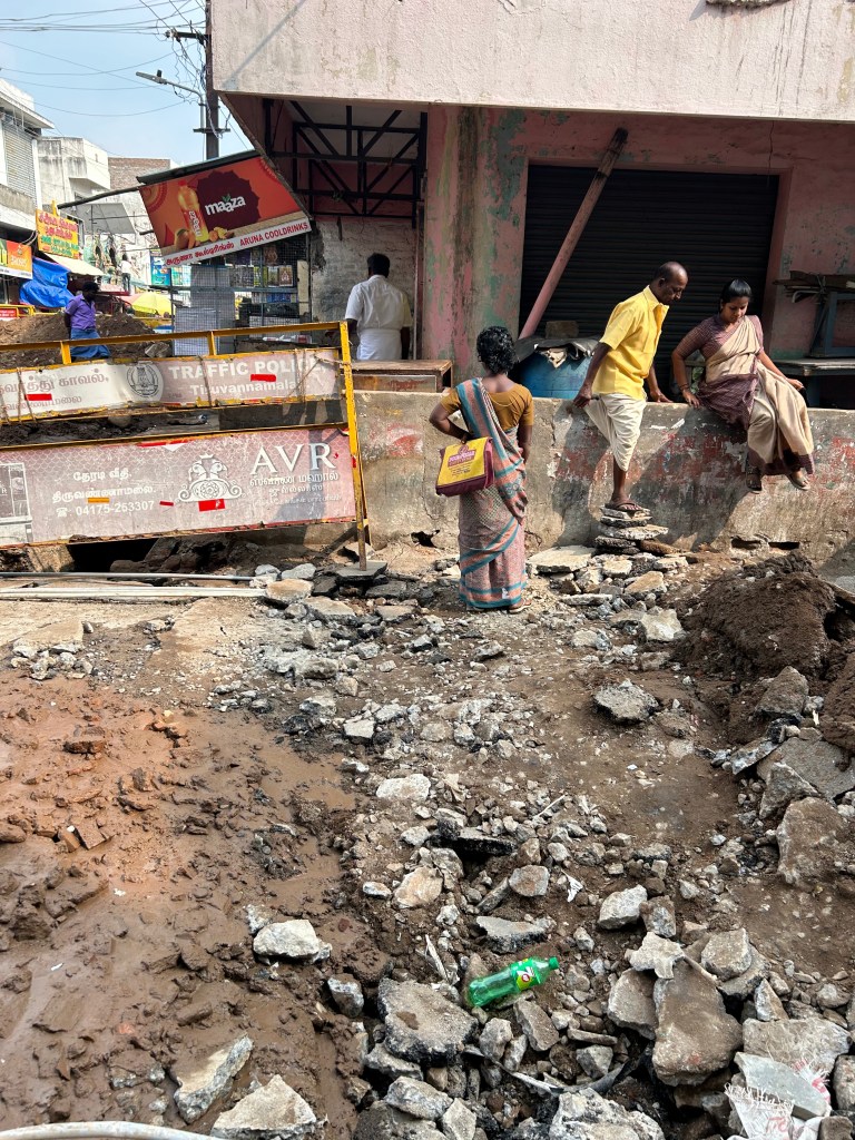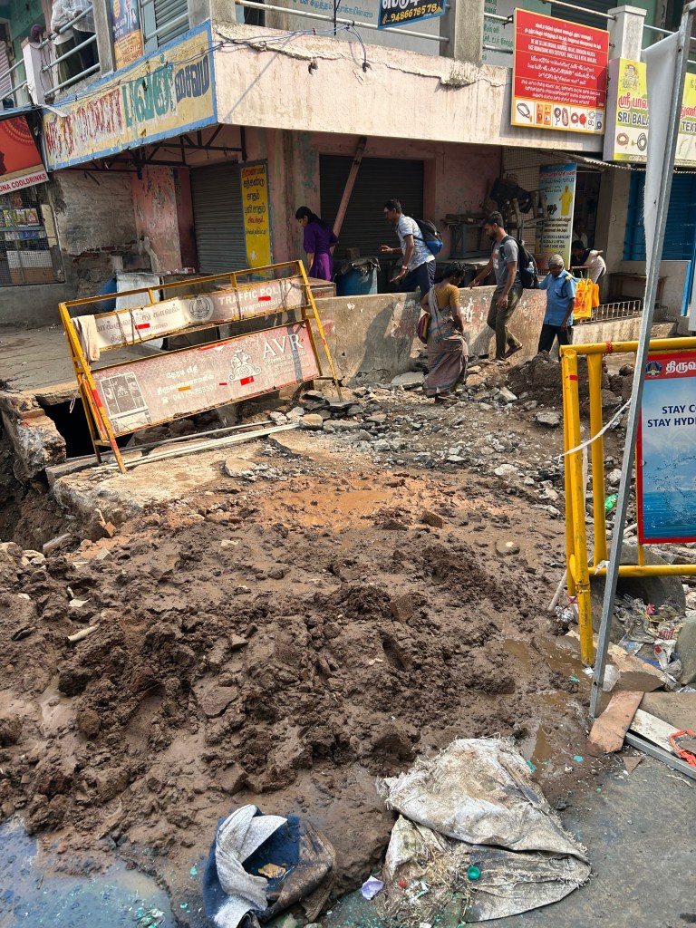 בסוף ההקפה יש קטע של בערך קילומטר שהוא מאוד לא נעים, הוא בתוך העיר, בחלקים הקשים שלה, לאורך תחנת האוטובוס, השוק, המקדש הגדול. הרבה פעמים אני מוותרת על החלק הזה. עולה על ריקשה. היום עשיתי את אותו המלסול כמו בכל הימים בשלושה שבועות האחרונים, רק שהיום איפה שעמדו הריקשות היה בור גדול מלא בבוץ ומים מזוהמים וטרקטור ענק שעשה משהו בנידון. מהצד השני של הבור ראיתי את הריקשות.