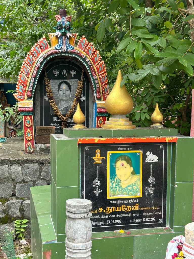 מצאתי בית קברות. ראיתי אותו כמובן מהצד השני, ותמיד חשבתי ששווה להיתעקב רגע ולהסתכל, כי אני מאוד אוהבת בתי קברות, אבל רק בהליכה נגד הזרם האנושי עשיתי את זה. בית הקברות טחוב בחלק שבין המדרכה והגדר שחוסמת את ההר, מה הופך אותו לארוך וצר, עם מצבות צבעוניות ועליהן תמונות של נפטרים חדשים יחסית, מהחמש עשרה שנים האחרונות, וקישוטים של מסגדים הינדים, כלומר פרחים, קטורת ובינדי. בית הקברות לא טובע בזבל, אבל בהחלט צף. הכביש עצמו והמדרכה מאוד נקיים, כל הזמן מנקים את המסלול של ההקפה. נראה כאילו חלק מהניקיון זה פשוט לדחוף זבל לשוליים. בית הקברות זה השוליים (לחיצה על תמונה תגדיל אותה).