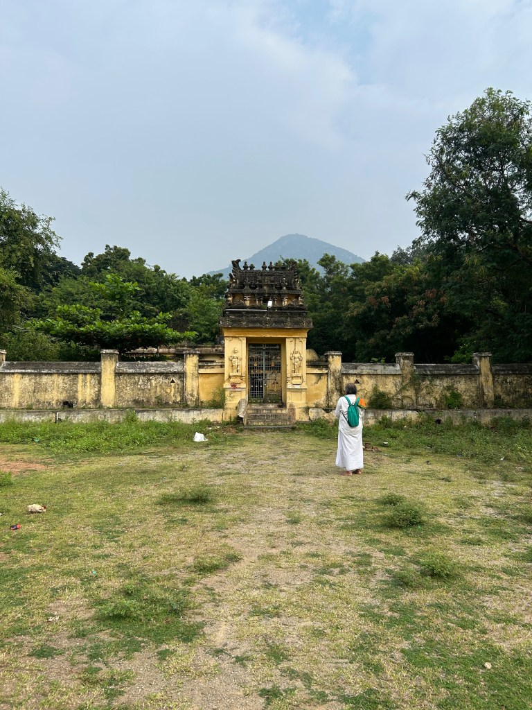 המסלול סביב ההר משתנה, יש בו חלקים, לכל חלק אופי אחר. אני מתחילה באשראם (לפי המסורת צריך להתחיל בטמפל שבעיר ושם לסיים). החלק הראשון הוא קצת לא כאן לא שם, אבל הוא הכרחי. מתחילים על כביש מרכזי כדי להגיע לכביש שמוקדש רק להקפה ולהולכים. החלק הזה, השני, הוא היפה בחלקים: ירוק, מוצל, מתחת לעצים, מלא טמפלים בצד אחד, ההר בצד השני (הולכים בצד שרחוק מההר). הלכתי עד קצת לפני הסוף של החלק היפה ואז הסתובבתי והלכתי נגד התנועה, בצד שקרוב אל ההר.